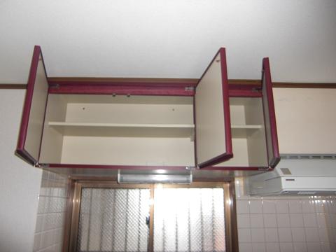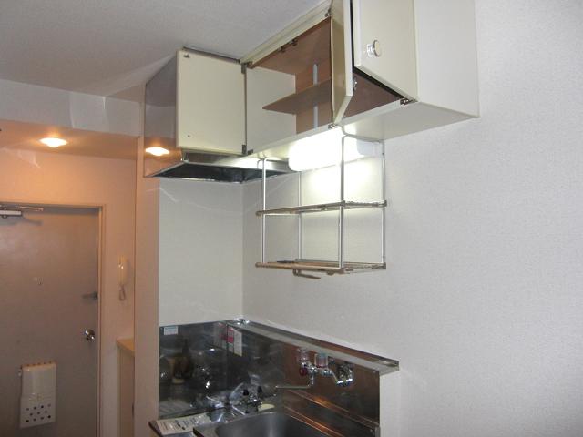 キッチンの上にはあるととても便利な鉄の棚がありますので、ペーパータオル、炊飯器、砂糖・塩・胡椒など置いときましょう。