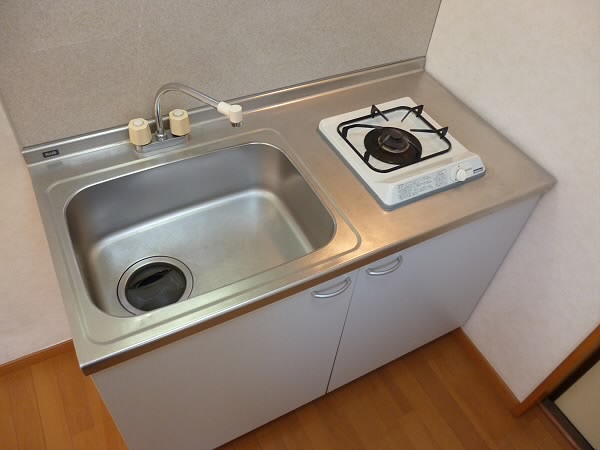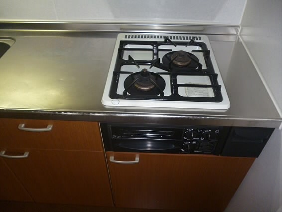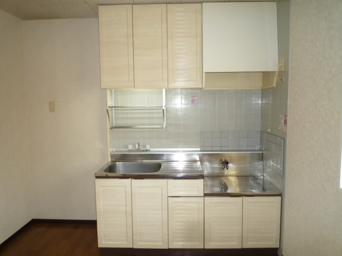 キッチンには収納が上下にあり、お鍋やフライパンなど