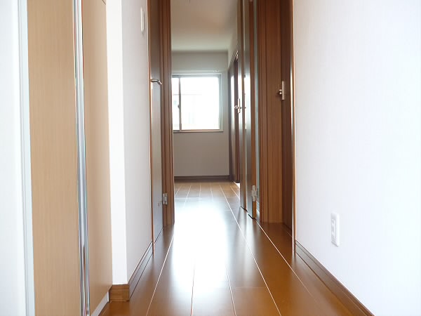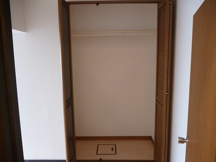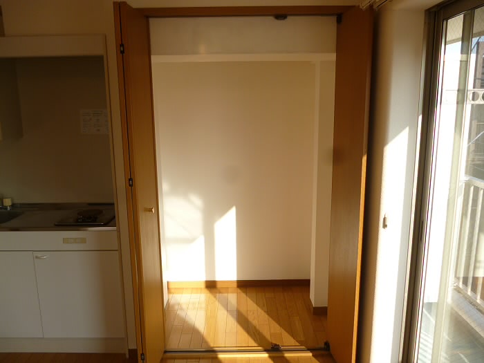明るい色のフローリング、クローゼットの色に、お日様が入って