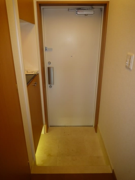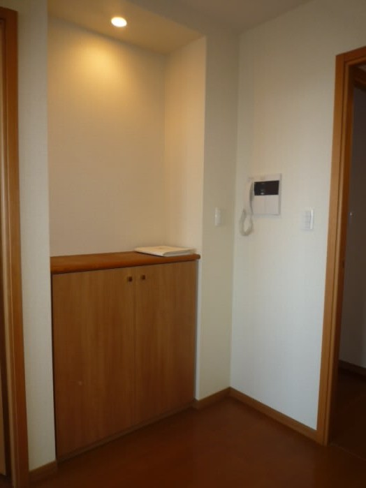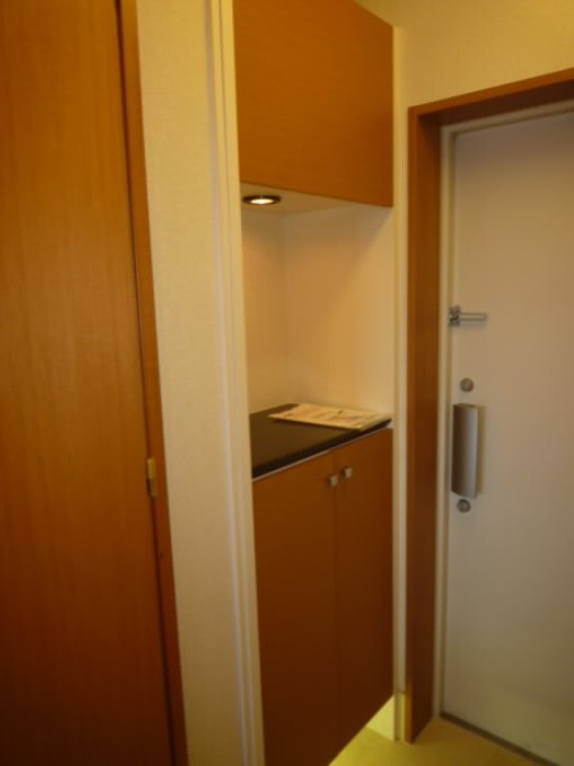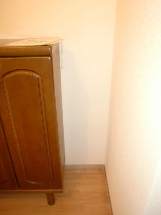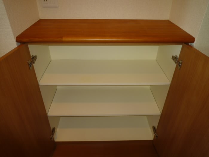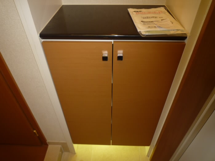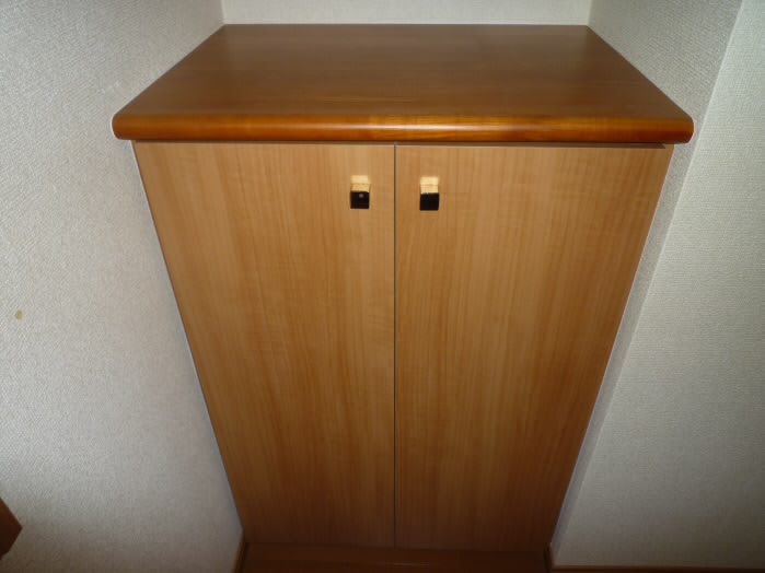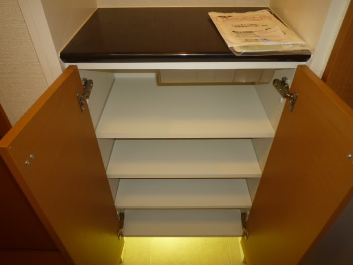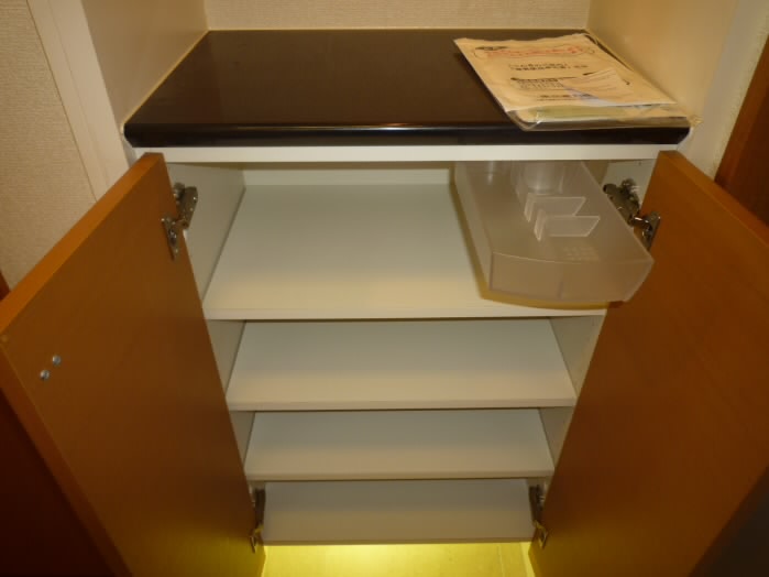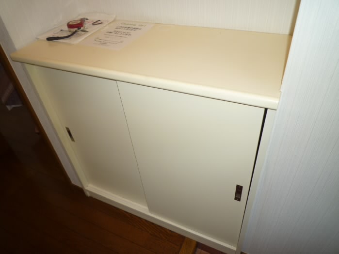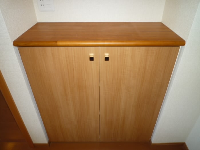 扉の右側には、上に物が置けるタイプの下駄箱があります。