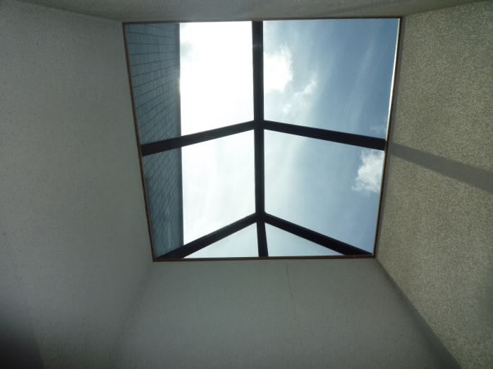 上を見上げると天窓があり、エントランスに日の光が届くので