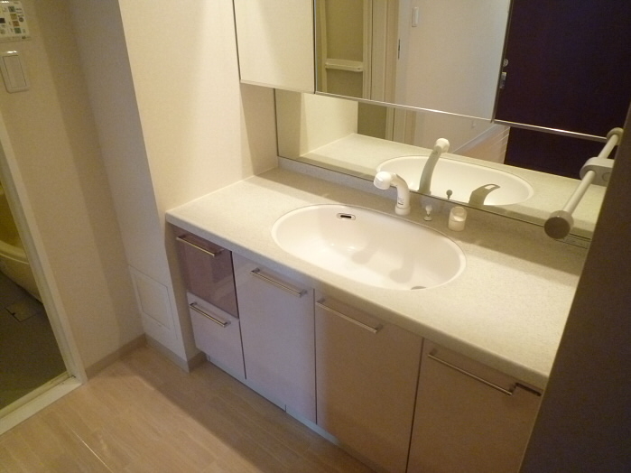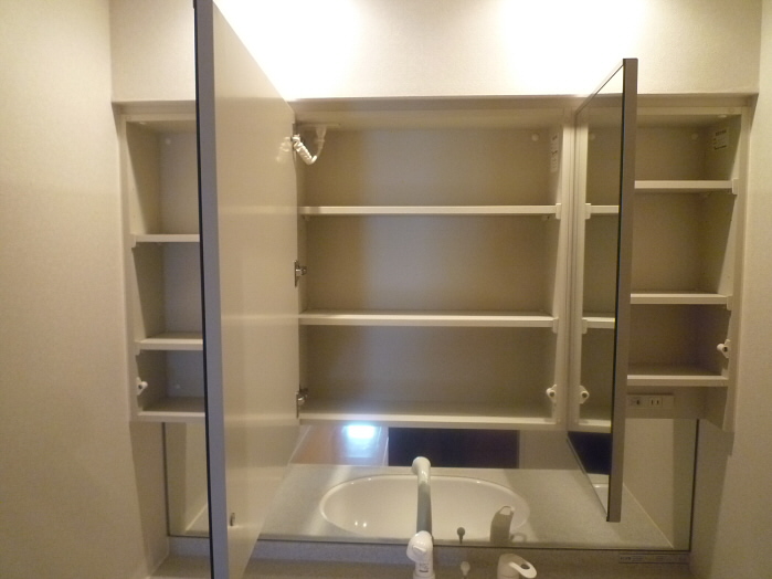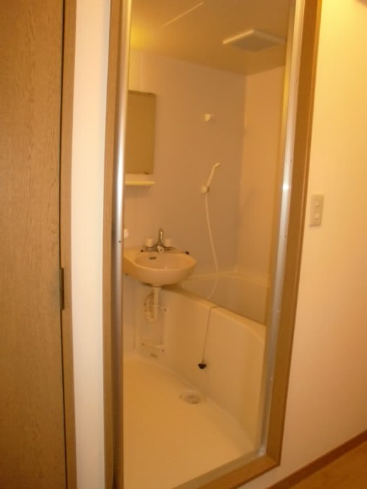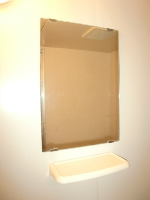 お風呂場には棚付きの鏡と、洗面台があります。
