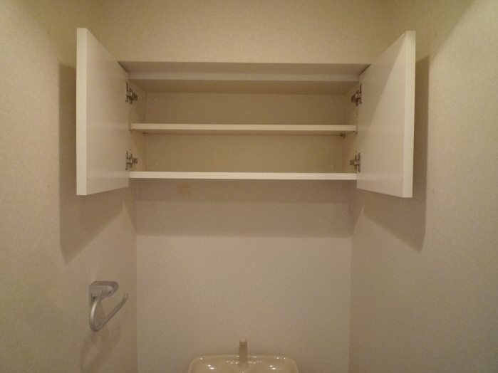 トイレの上には収納棚がありますので、トイレットペーパーや、