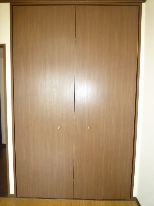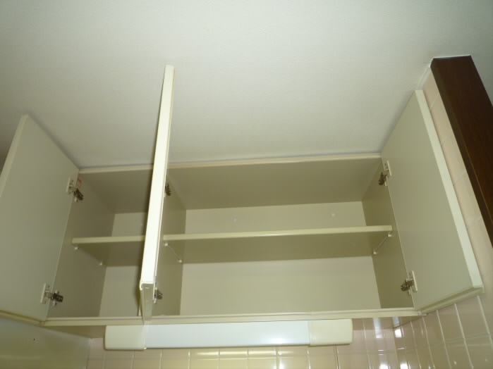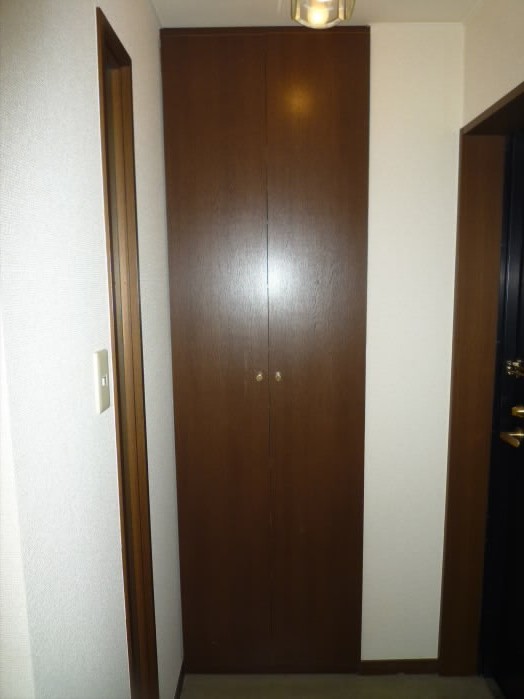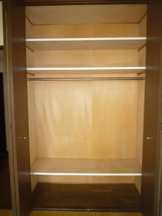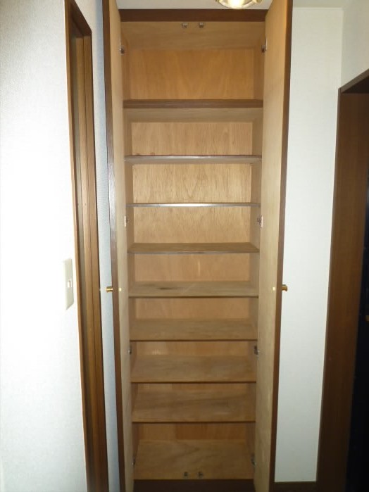 入り口側の壁には6段もある収納棚がありますので、