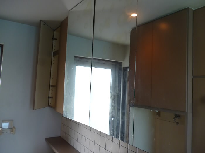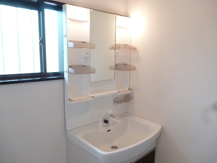 洗面台の頭上と入り口に戸棚があります!