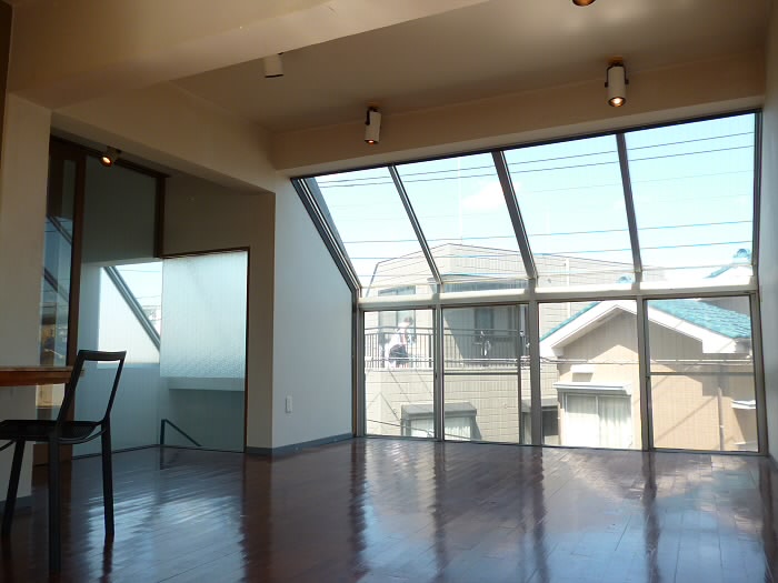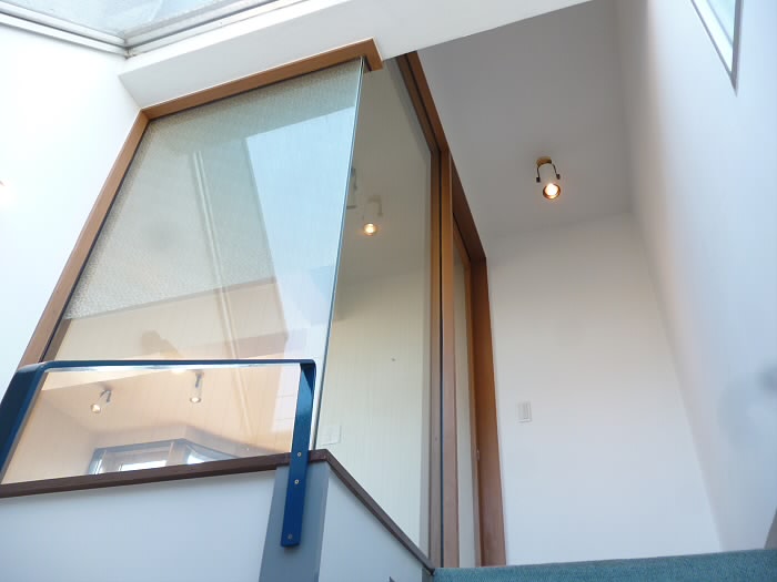 2階LDKの一角はガラス張りになっていて、階段の閉塞感の軽減に一役買っています♪