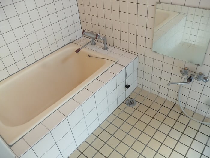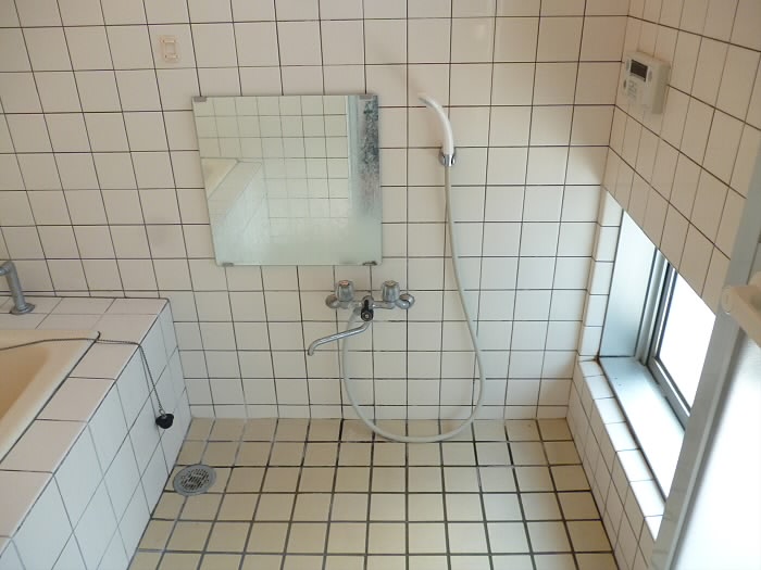 お風呂は床から壁にいたるまで、同じ白タイルで覆われていてキュービックな印象ですね!